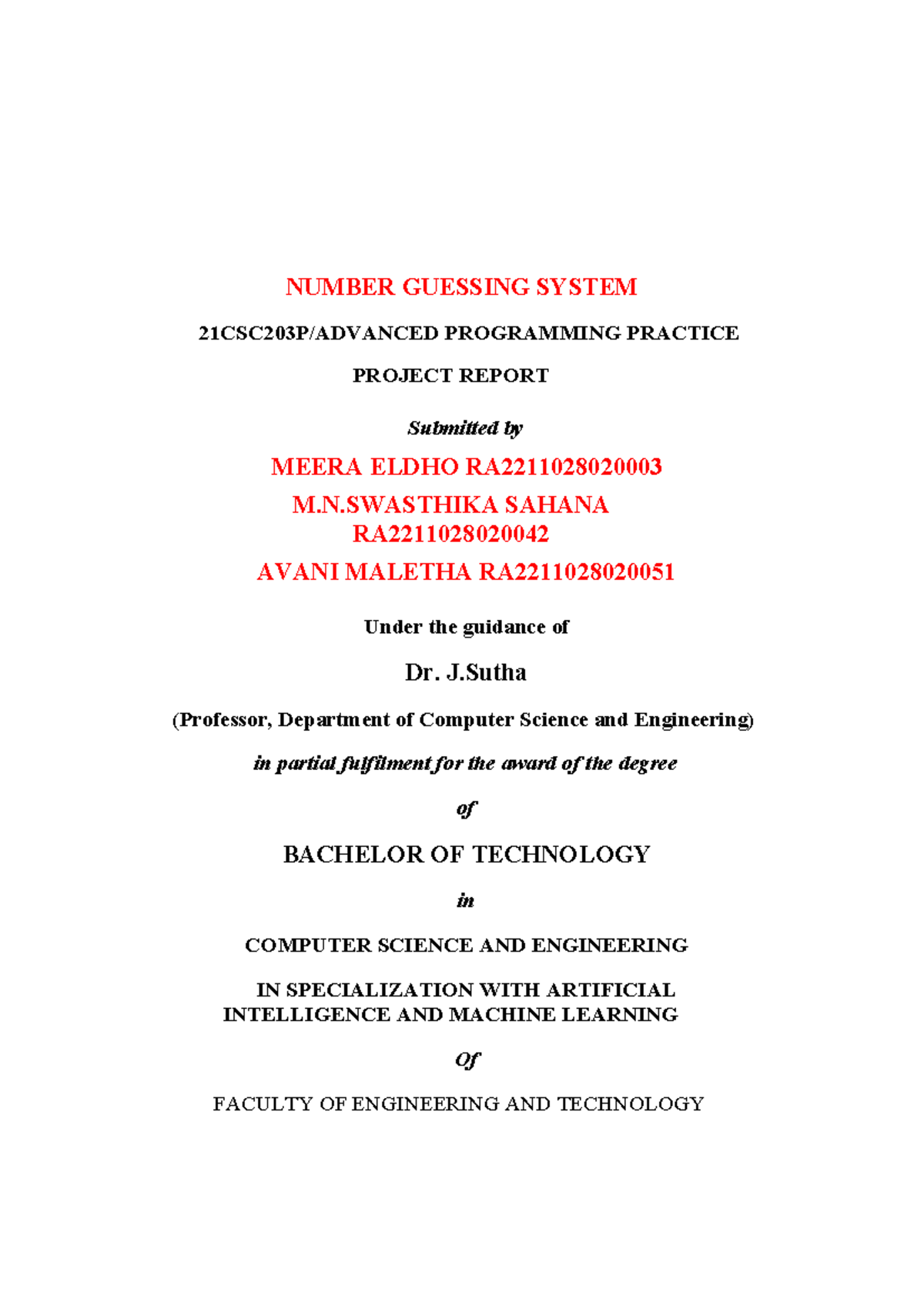 Number Guessing Game Project Report - B.Tech CSE AI & ML - Studocu