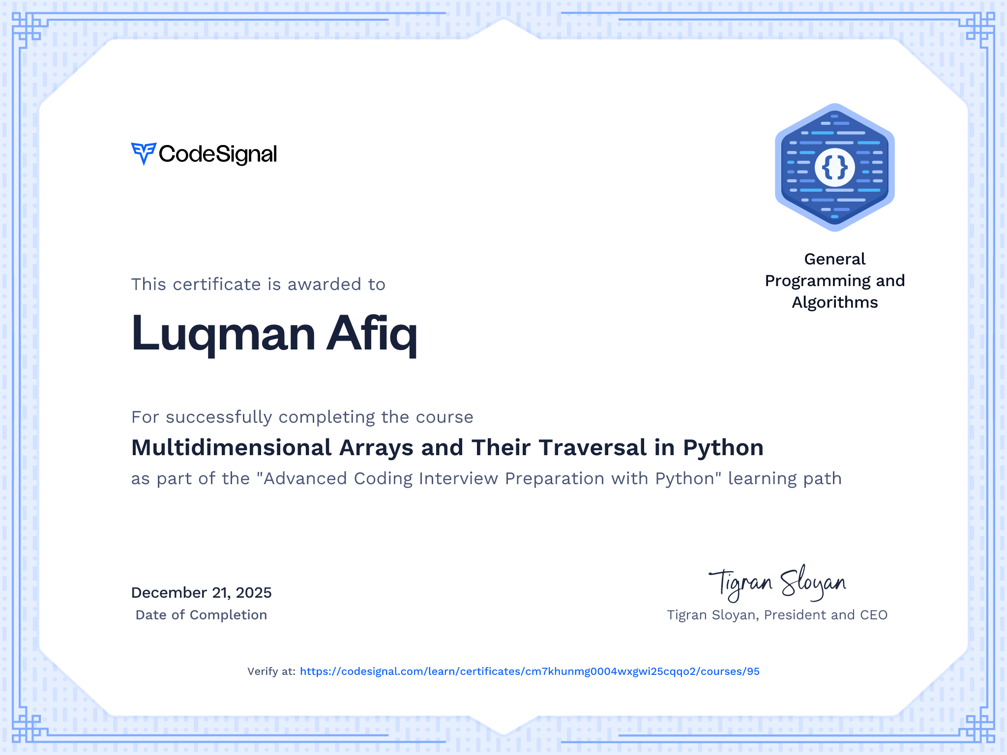 Course certificate for Multidimensional Arrays and Their Traversal in ...