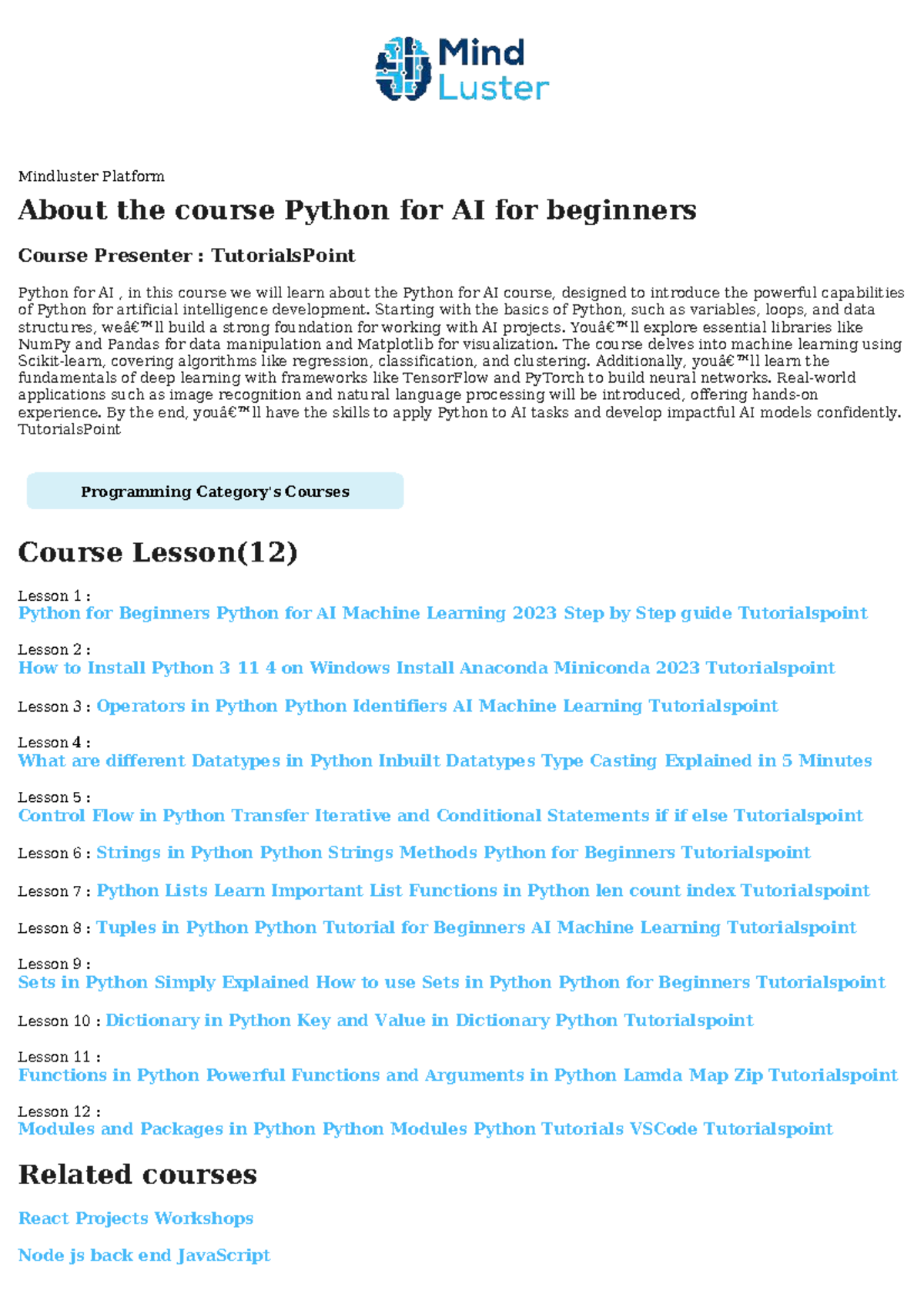Python for AI for beginners Course Content - Mindluster Platform About ...