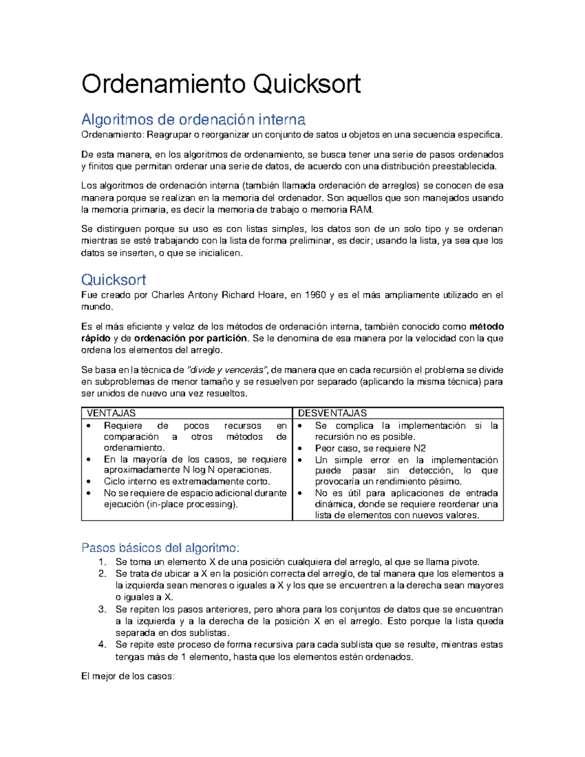 Quicksort: Algoritmo de Ordenamiento Eficiente y sus Ventajas - Studocu