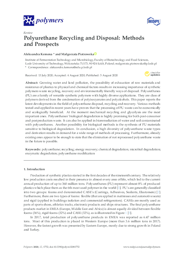 (PDF) Polyurethane Recycling and Disposal: Methods and Prospects