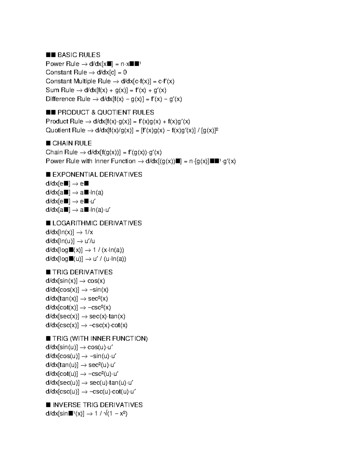Derivative Formula Quizlet Set - nn BASIC RULES Power Rule → d/dx[xn ...