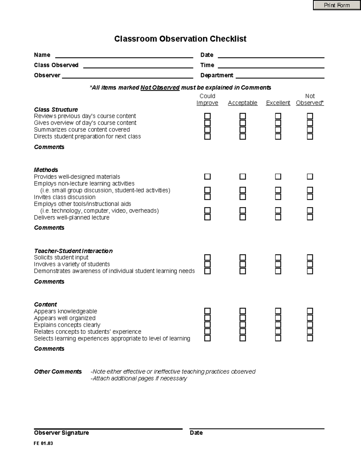 Classroom Observation Form - Classroom Observation Checklist Teaching ...