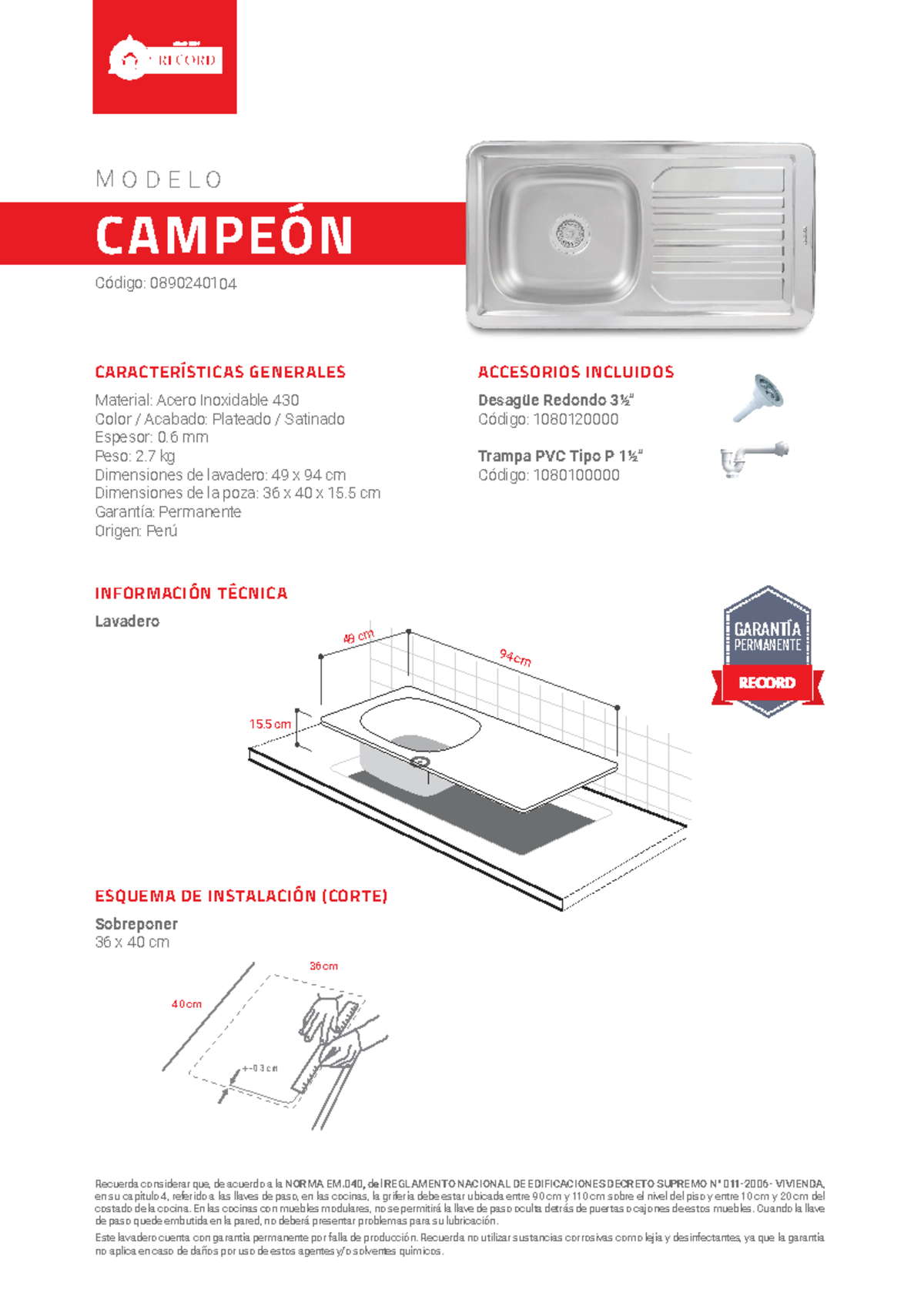 0890240104 0 Campeon - greeeessss - ACCESORIOS INCLUIDOS Desagüe ...