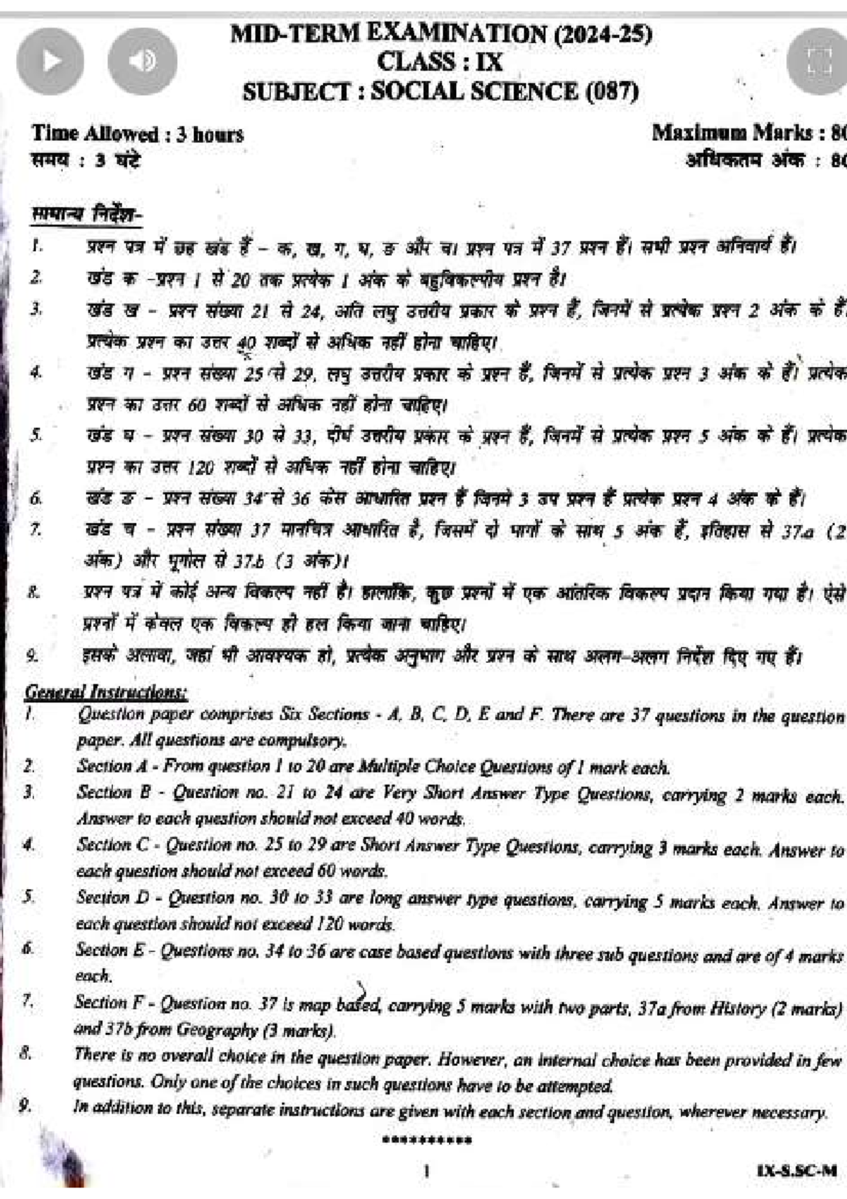 Social Science Exam Paper for Class IX (087) - 3 Hours, 80 Marks - Studocu