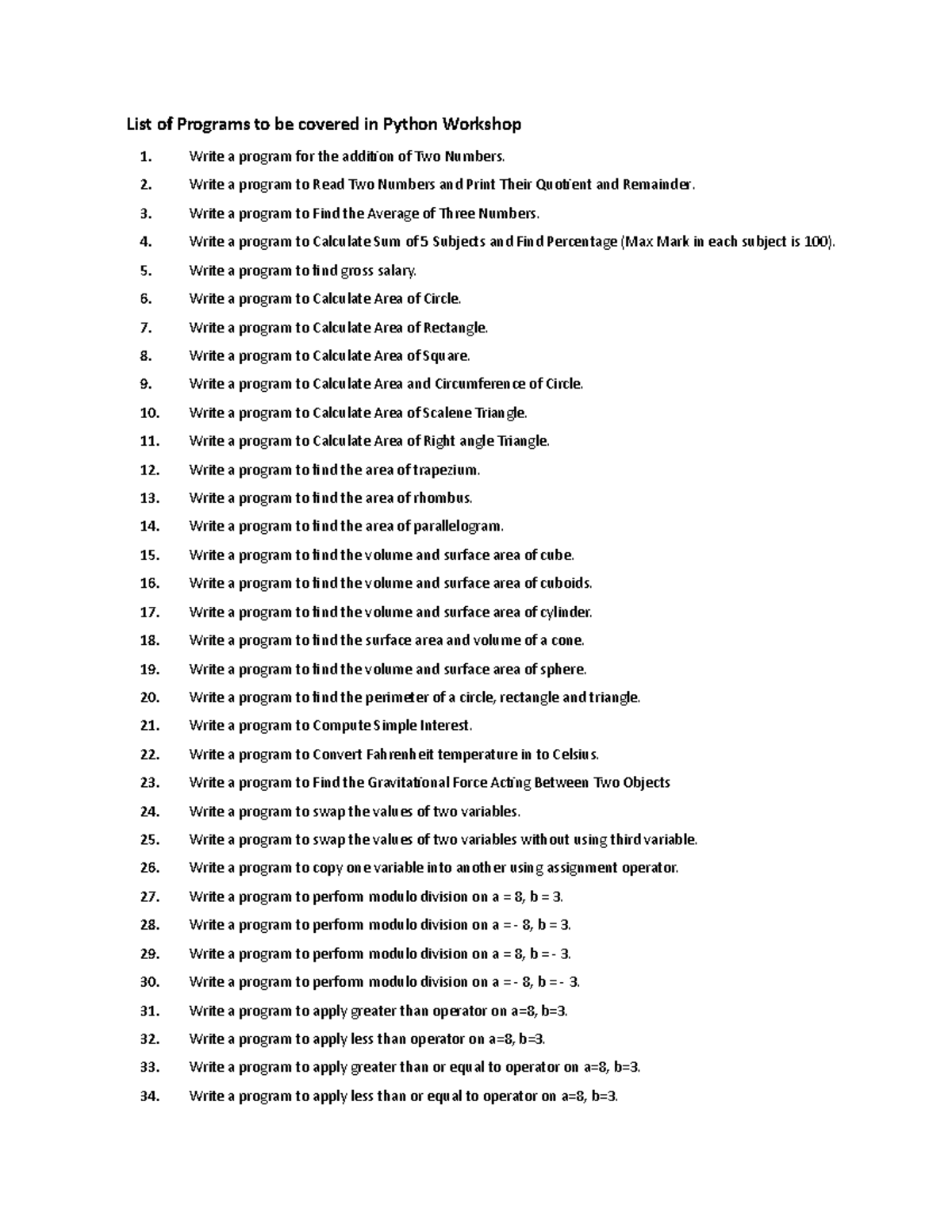 Python Program For Workshop - List of Programs to be covered in Python ...
