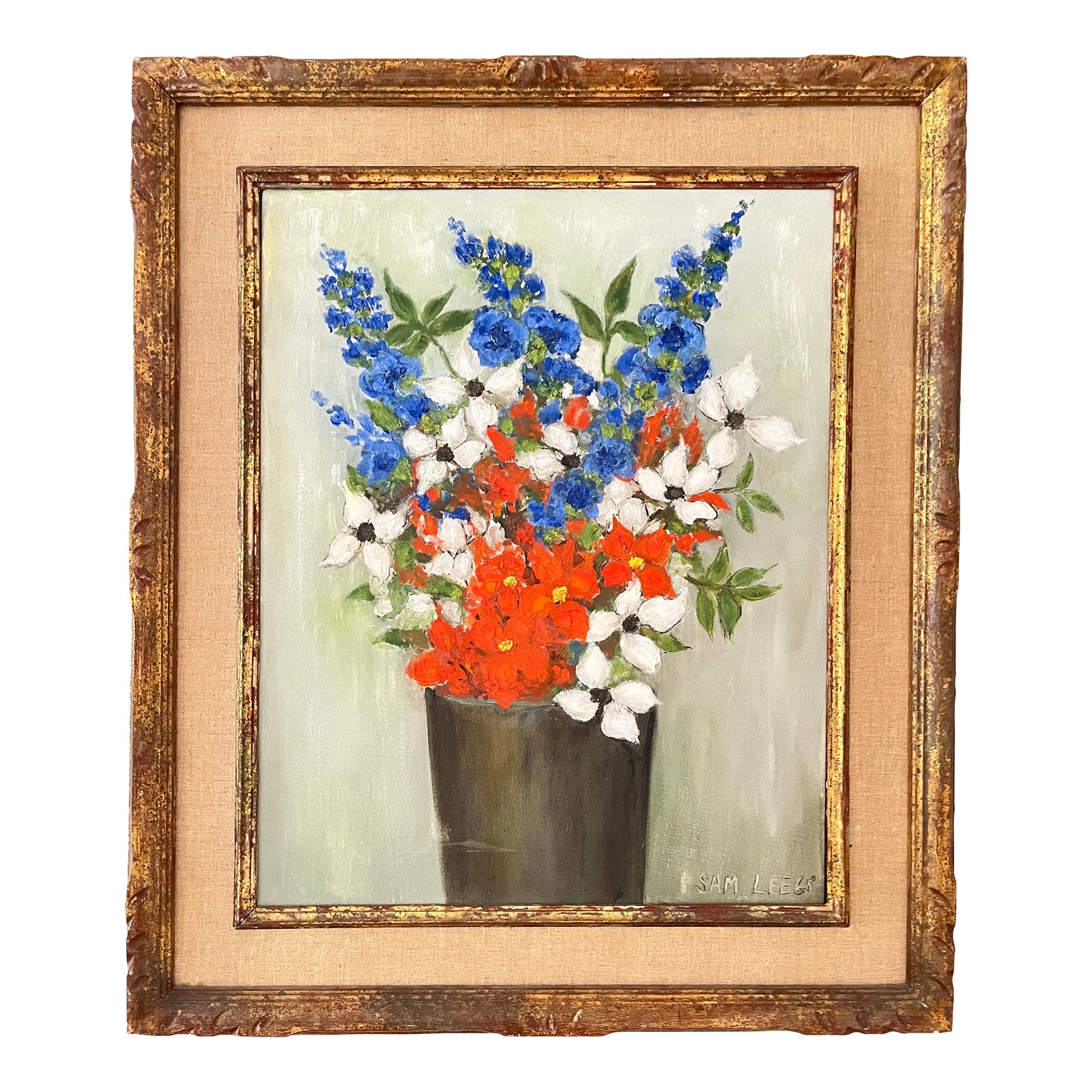 Mid Century Oil Painting of Flowers in a Vase by Sam Lee | Chairish