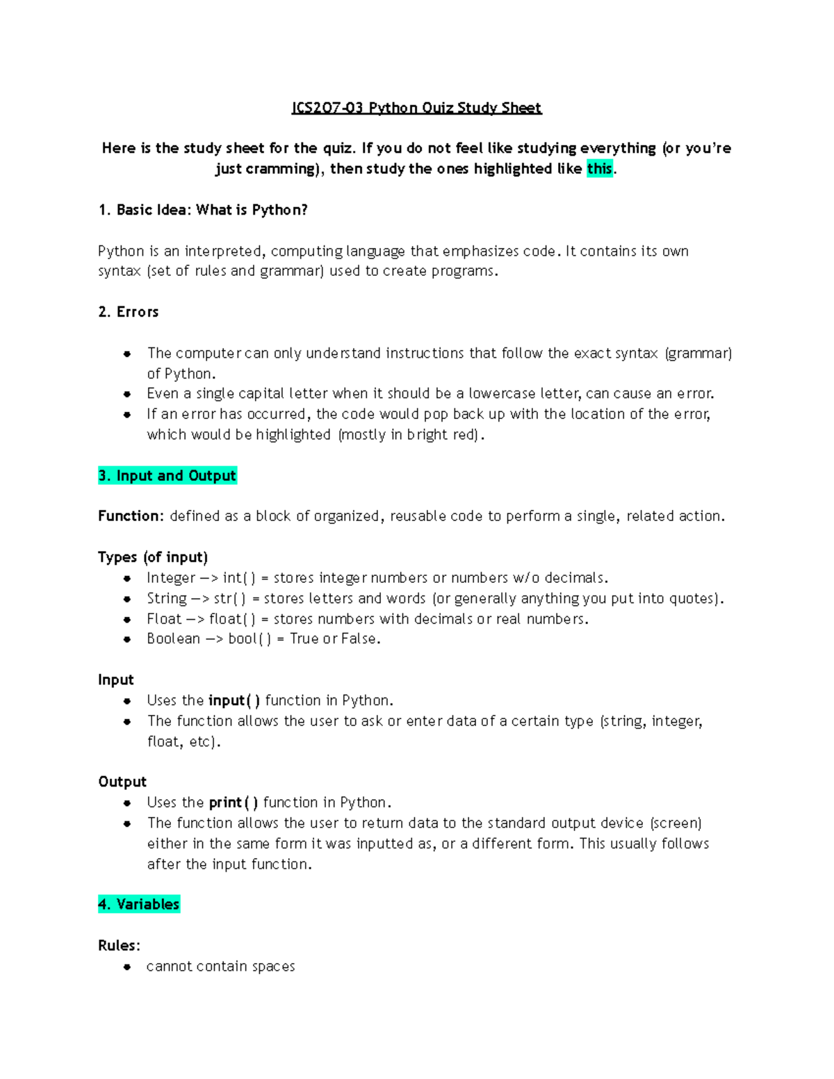 ICS2O7 Python Quiz Study Sheet - ICS2O7-03 Python Quiz Study Sheet Here ...
