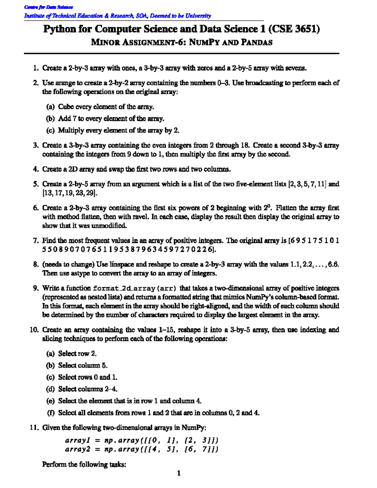 Minor Assignment-6: NumPy & Pandas Tasks (CSE 3651) - Studocu