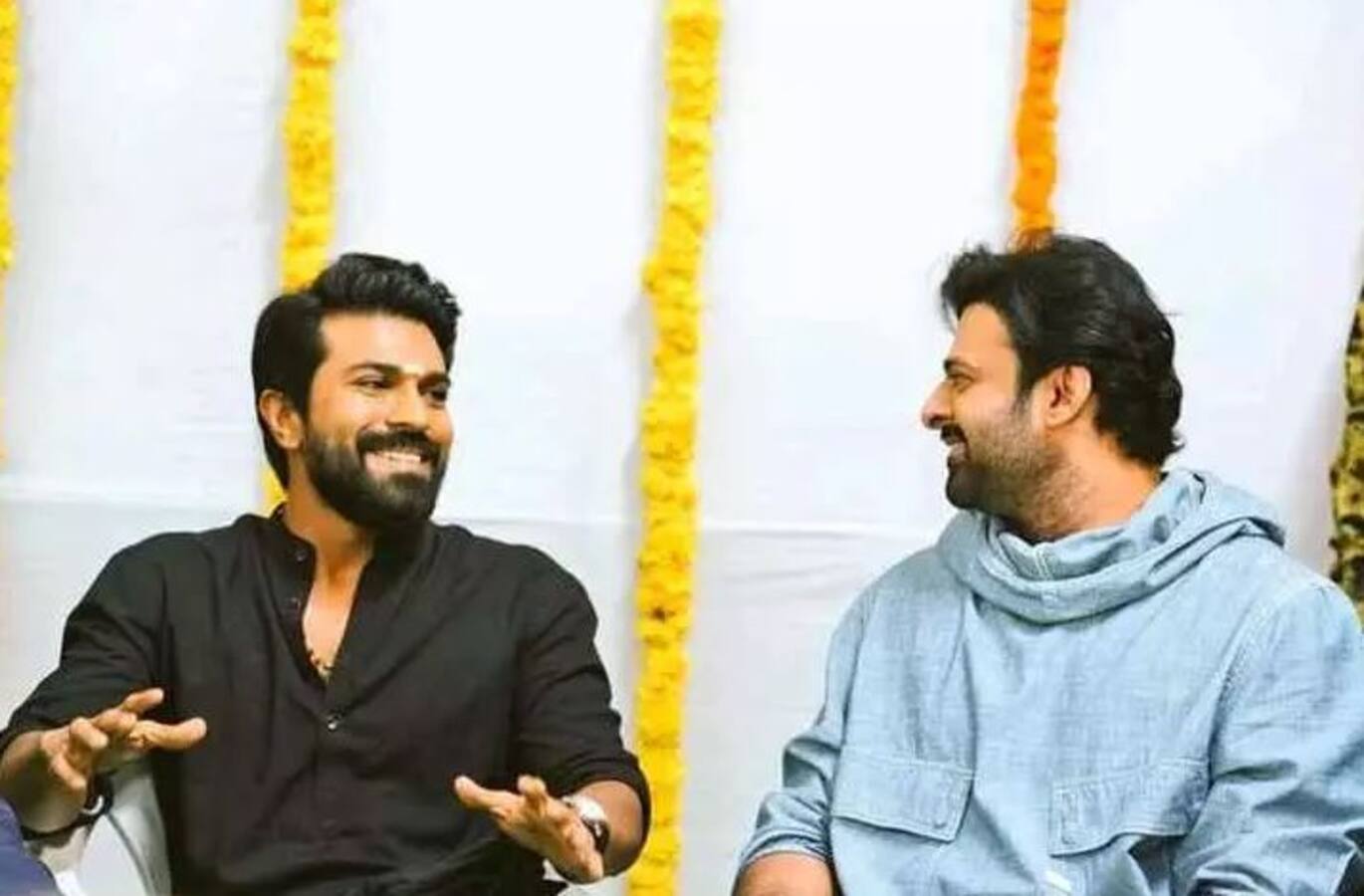 Based on this image's title: “ప్రభాస్ & రామ్ చరణ్ ఎంత మంచి వారో చూడండి! #ramcharan #Prabhash # ...”