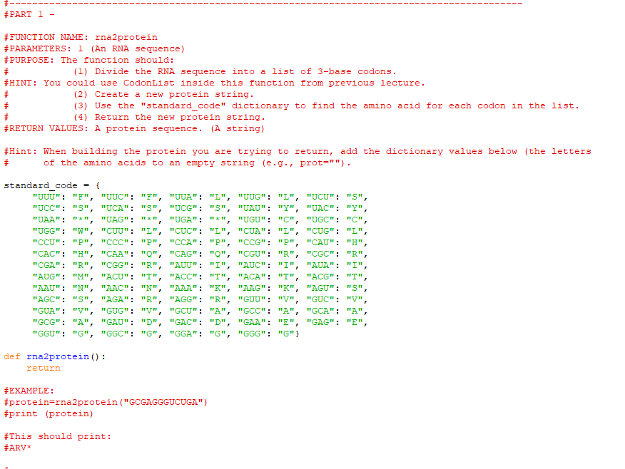 Solved #PART 1 #FUNCTION NAME: rna2protein #PARAMETERS: 1 | Chegg.com