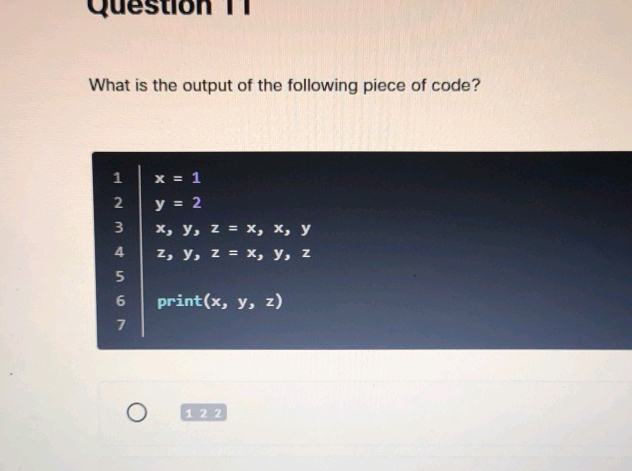 11) Identify the output of the following python code. \begin{array} { l }..