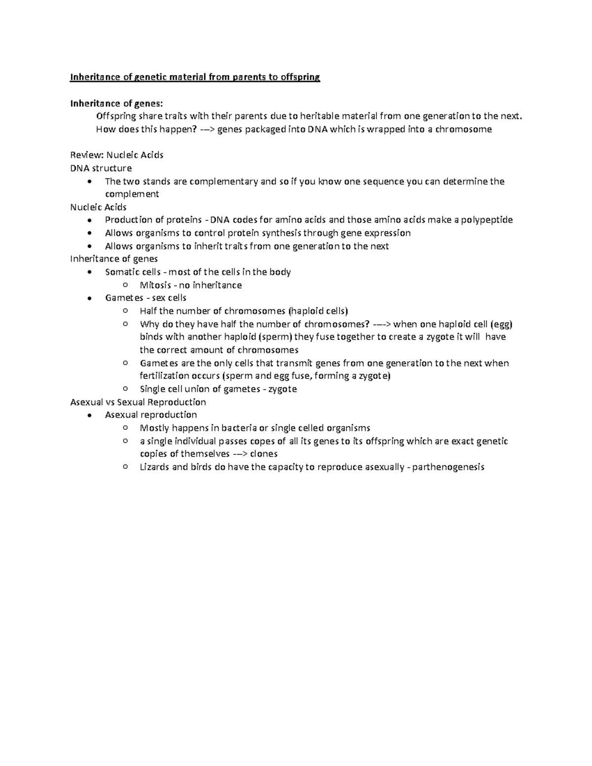 Lecture 21 notes - Inheritance of genetic material from parents to ...