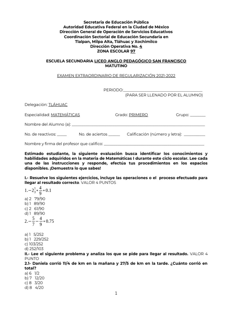 Examen Extraordinario 2021-2022 | PDF | Prueba (evaluación) | Matemáticas
