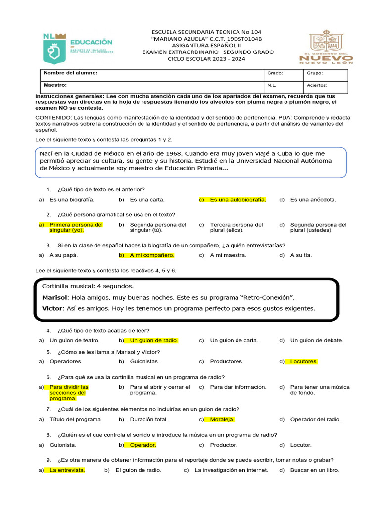 Examen Extraordinario Español II 2023 | PDF | Vejez | Radiodifusión
