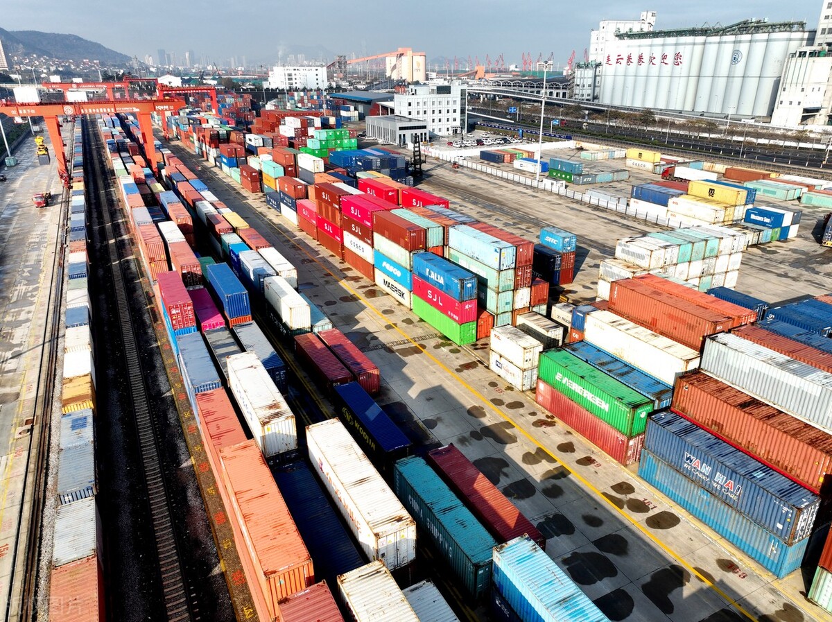 Containers carrying items for export are piled up at a port in ...