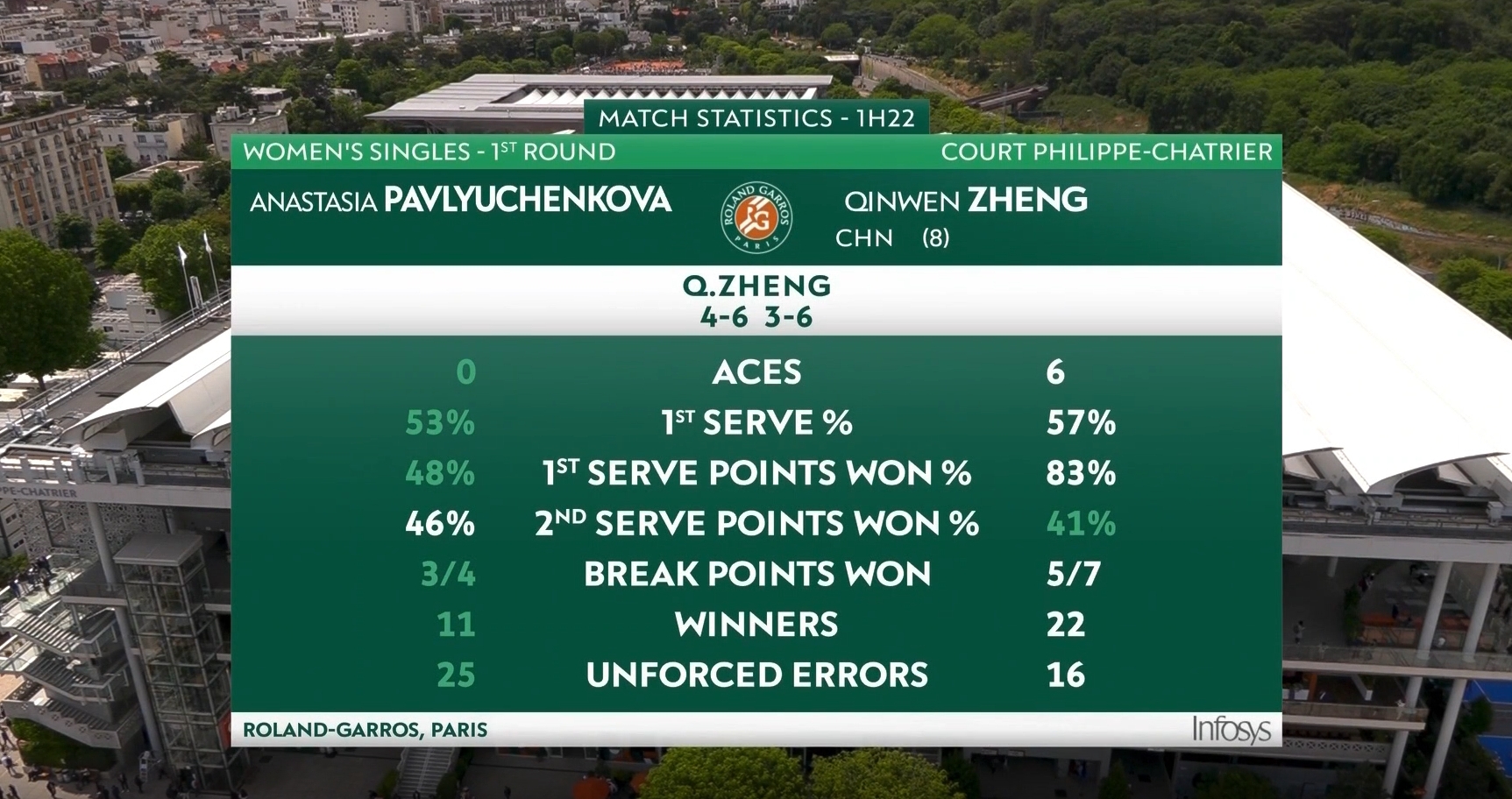 郑钦文首战数据:6记ACE+22个制胜分 除二发赢球率全部领先