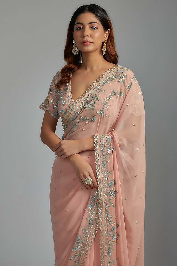 Peach Georgette Embroidered Saree Set by Summer by Priyanka Gupta at ...