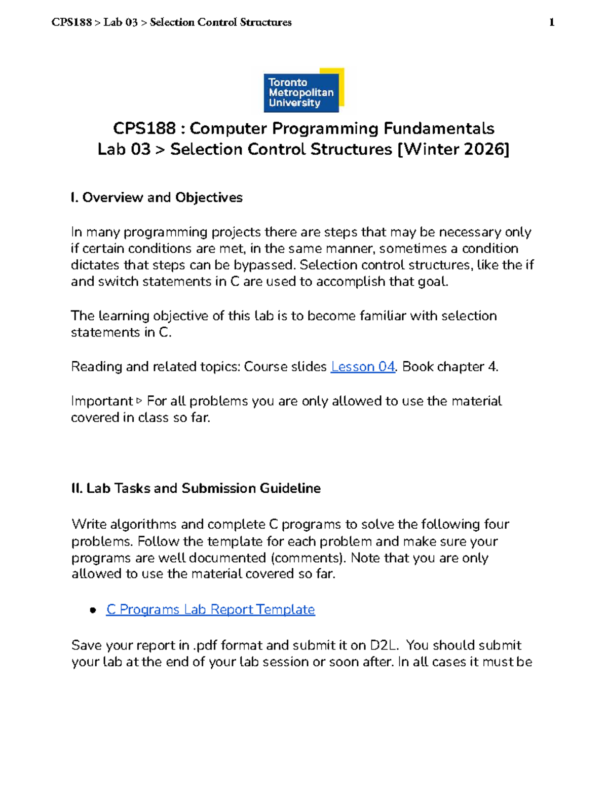 CPS188 Lab 03: Mastering Selection Control Structures in C - Studocu