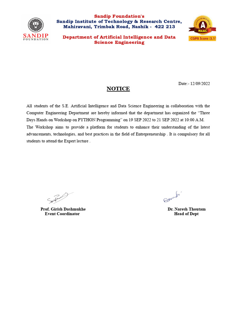Two-Day Workshop On PYTHON PROGRAMMING - NHCK