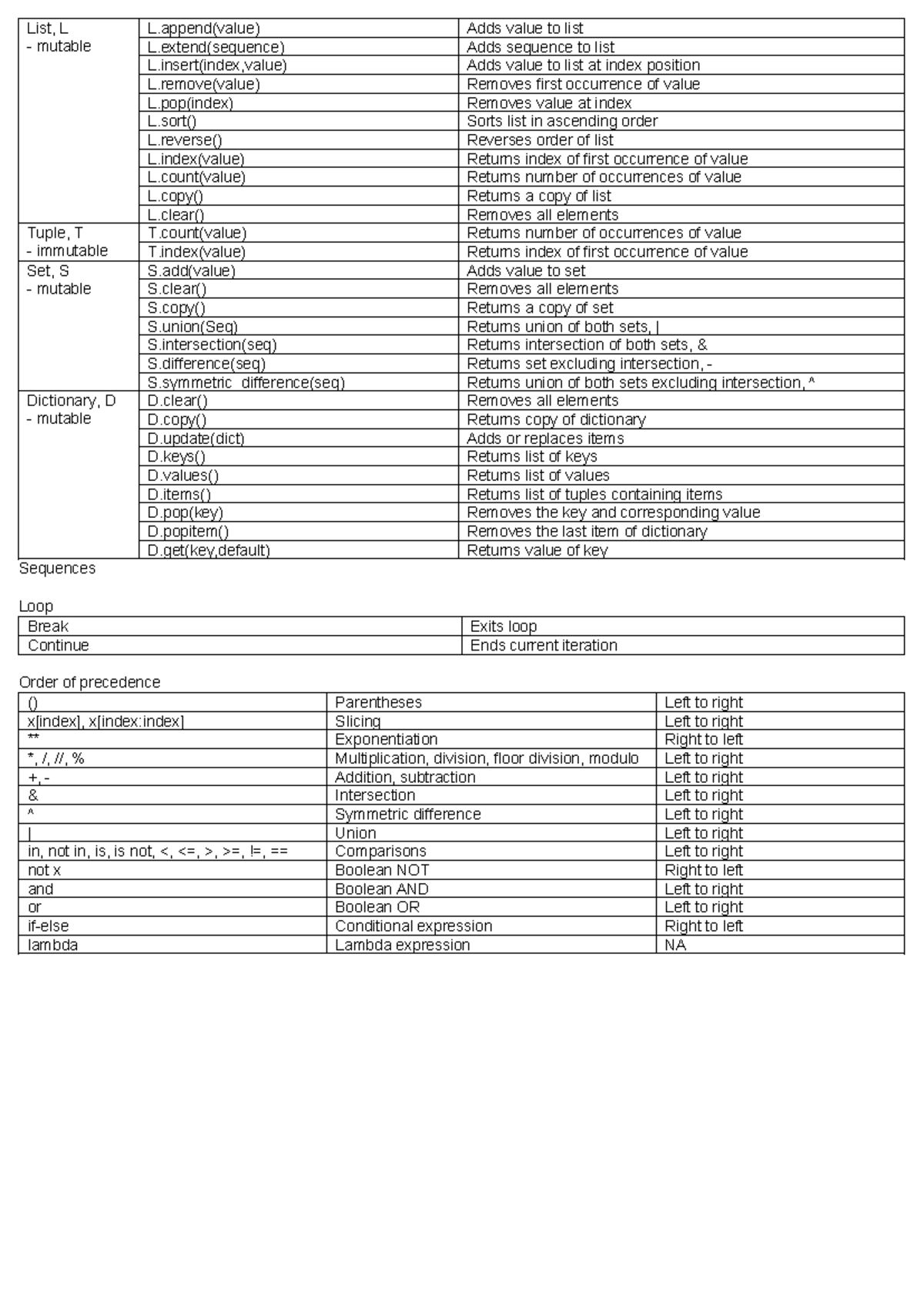 CS1010E Cheatsheet - List, L mutable L(value) Adds value to list L ...