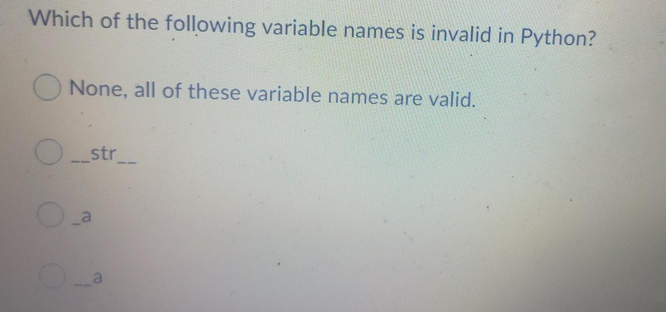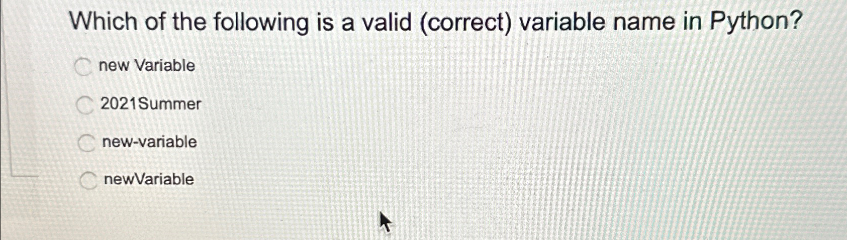 Solved Which one is a valid Variable name in Python? Select | Chegg.com
