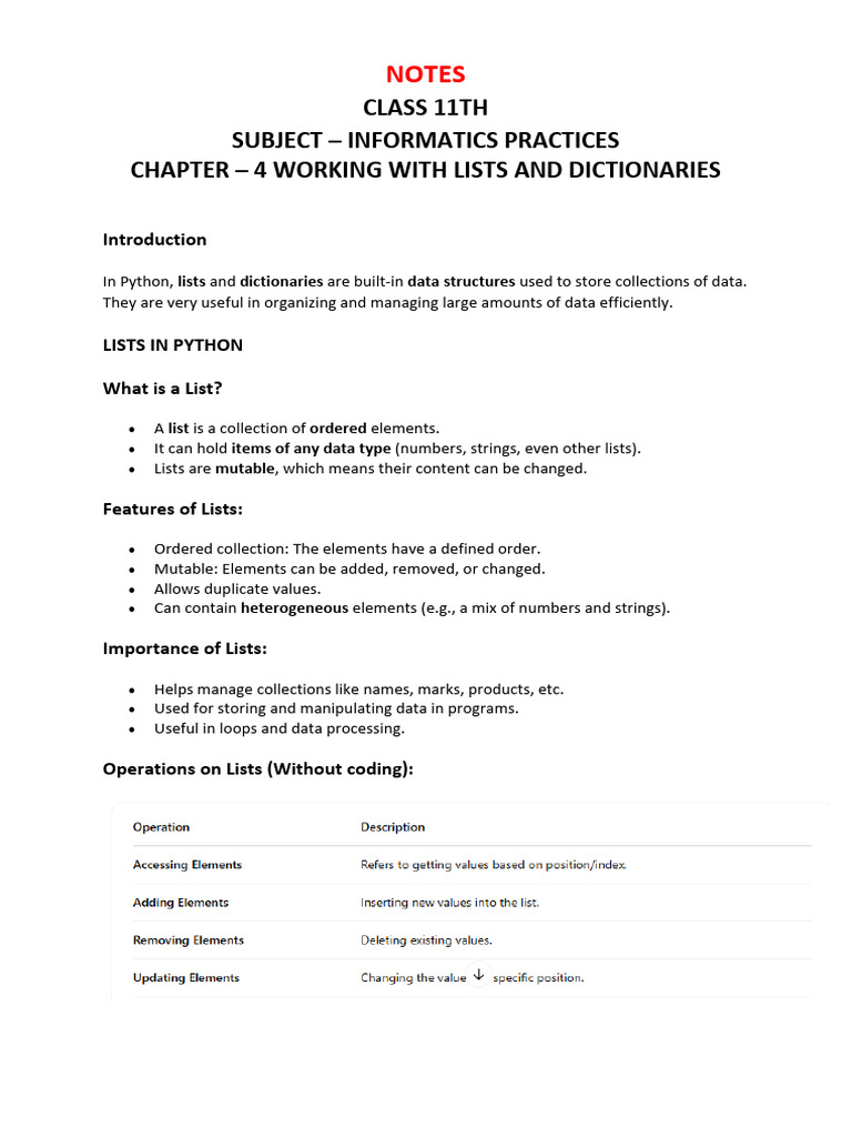 Class 11 IP: Lists & Dictionaries Notes | PDF | Information Technology ...