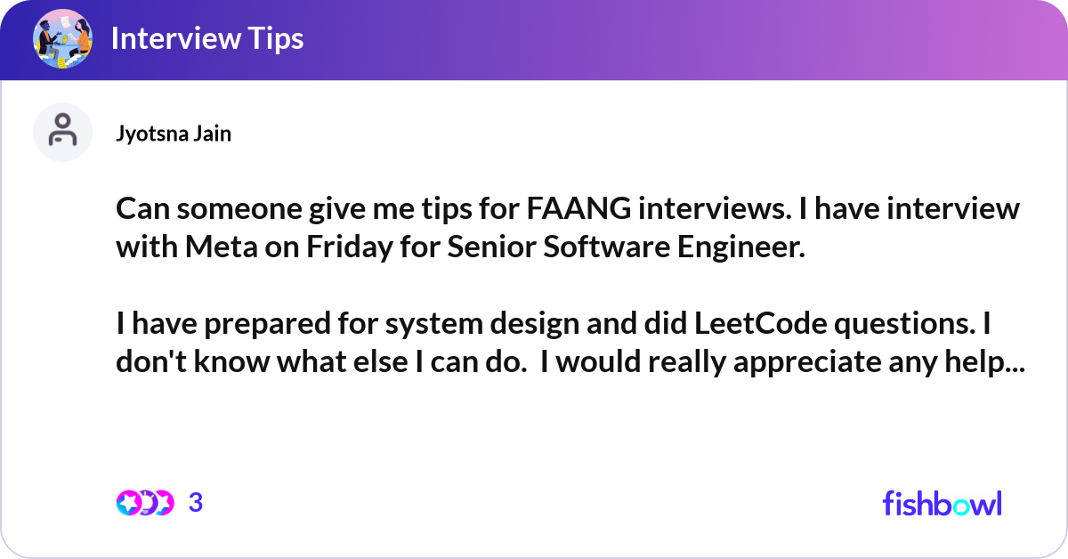 Can someone give me tips for FAANG interviews. I h... | Fishbowl