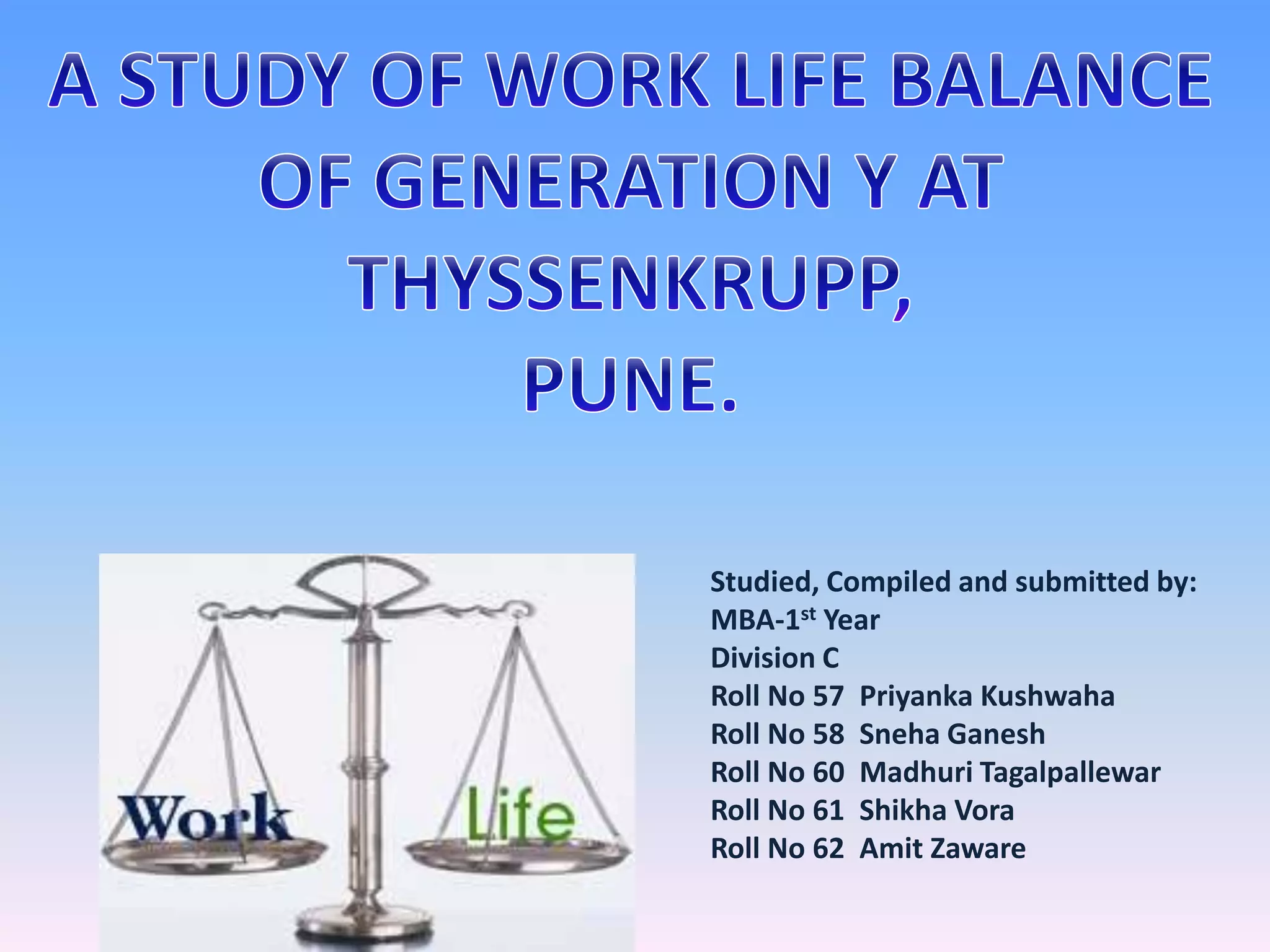 Rm ppt on A STUDY OF WORK LIFE BALANCE OF GENERATION Y AT THYSSENKRUPP ...
