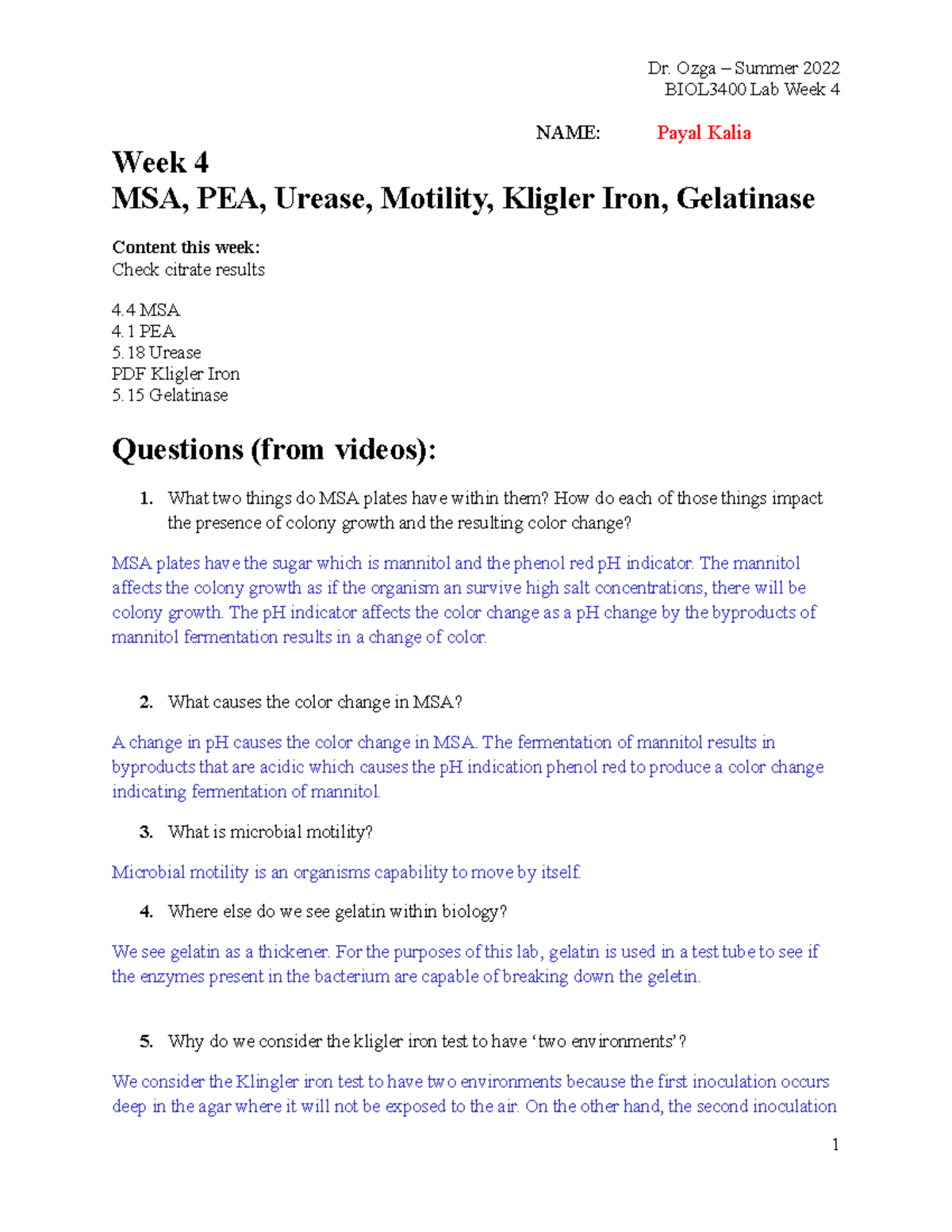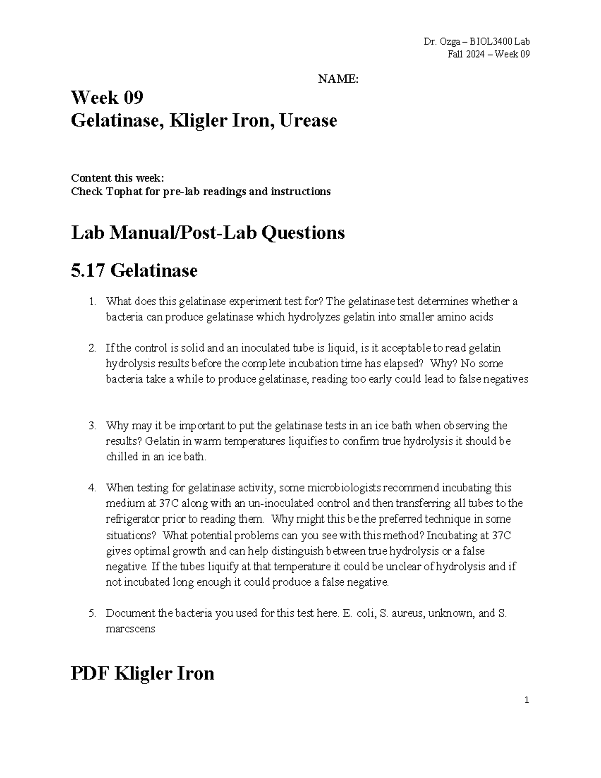 Week09 Gelatinase Kligler Urease - Dr. Ozga – BIOL3400 Lab Fall 20 24 ...