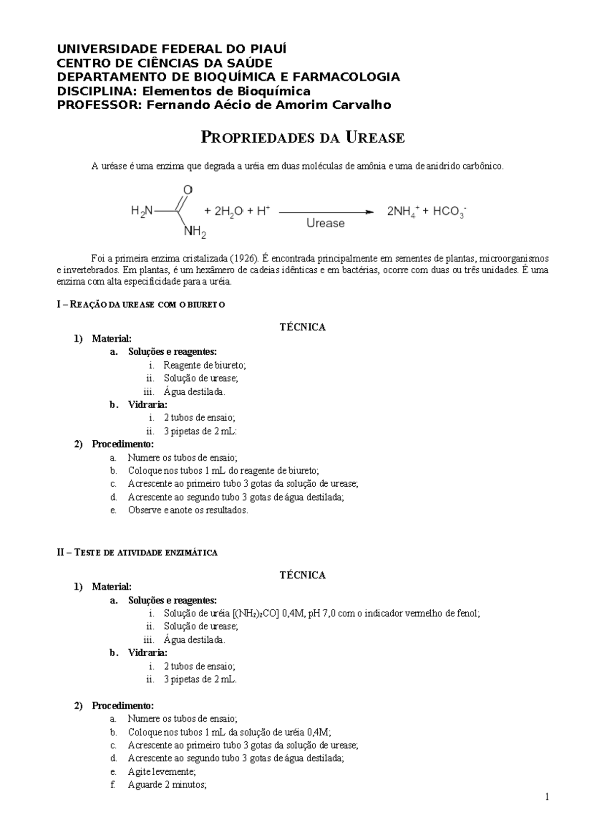Propriedades da Urease: Métodos de Teste e Análise - Bioquímica ...