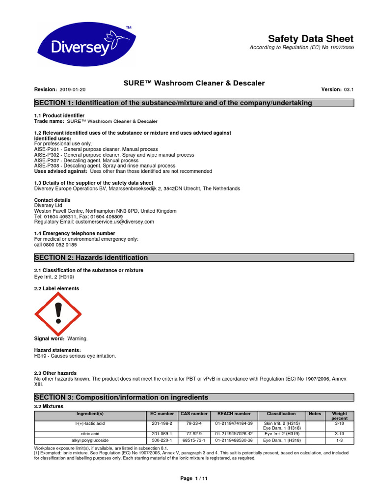 DIversey Sure Washroom Cleaner and Descaler | PDF | Toxicity | Personal ...