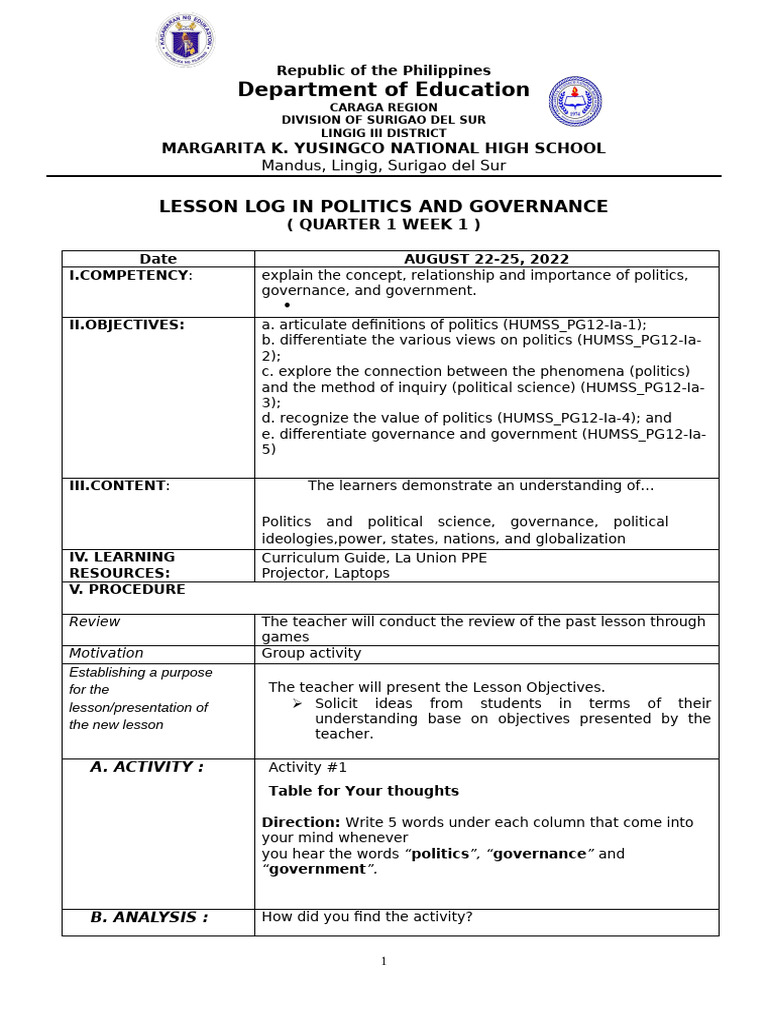 Lesson Plan For Philippine Politics and Governance | PDF | Lesson Plan ...