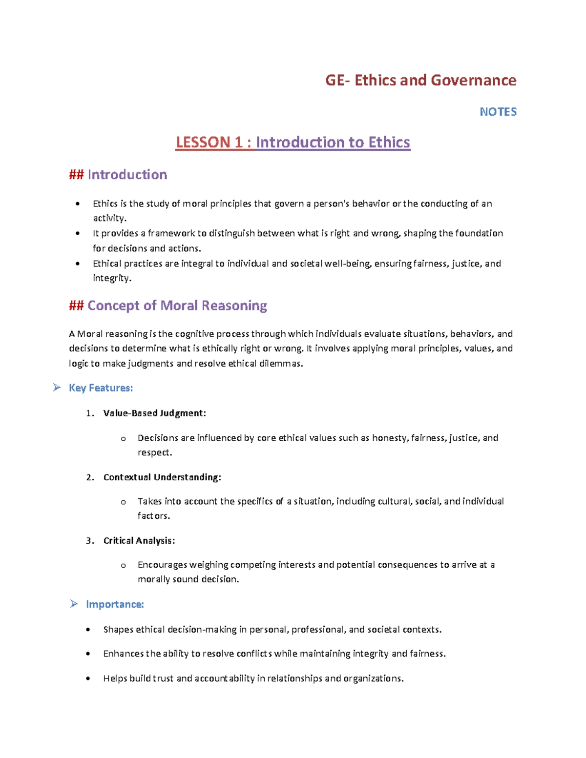 GE- Ethics and Governance Lesson Notes & Concepts Summary - Studocu