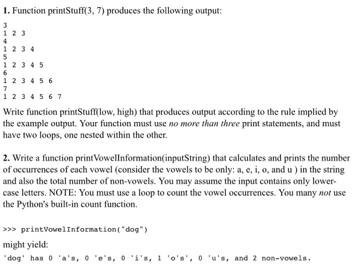 Solved 1. Function printStuff(3, 7) produces the following | Chegg.com