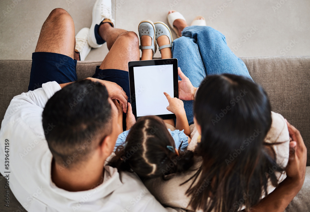 Blank family tablet, child and green screen with mockup of kids app ...