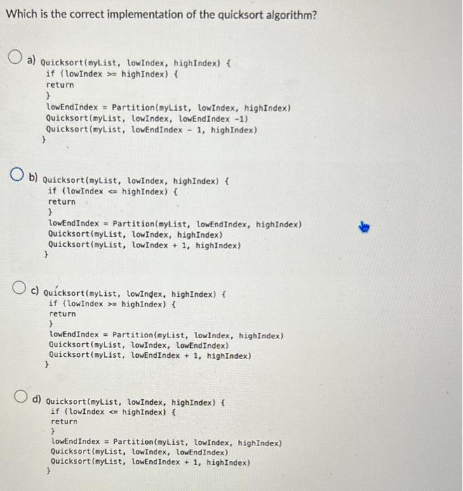 Solved Which is the correct implementation of the quicksort | Chegg.com