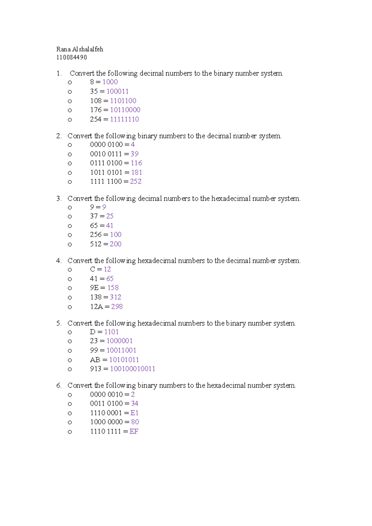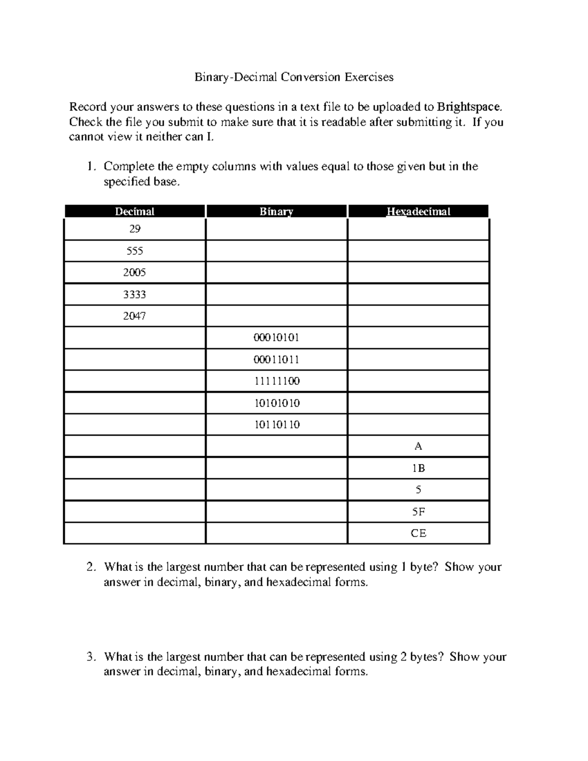 Conversion Exercises: Binary, Hex, and Decimal Worksheet - Studocu