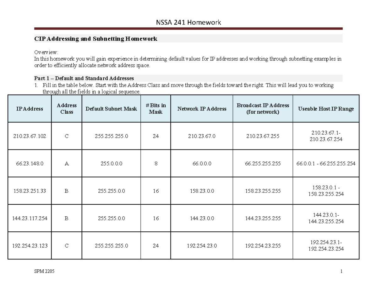 NSSA 241 - Subnetting Homework 2205 - CIP Addressing and Subnetting ...