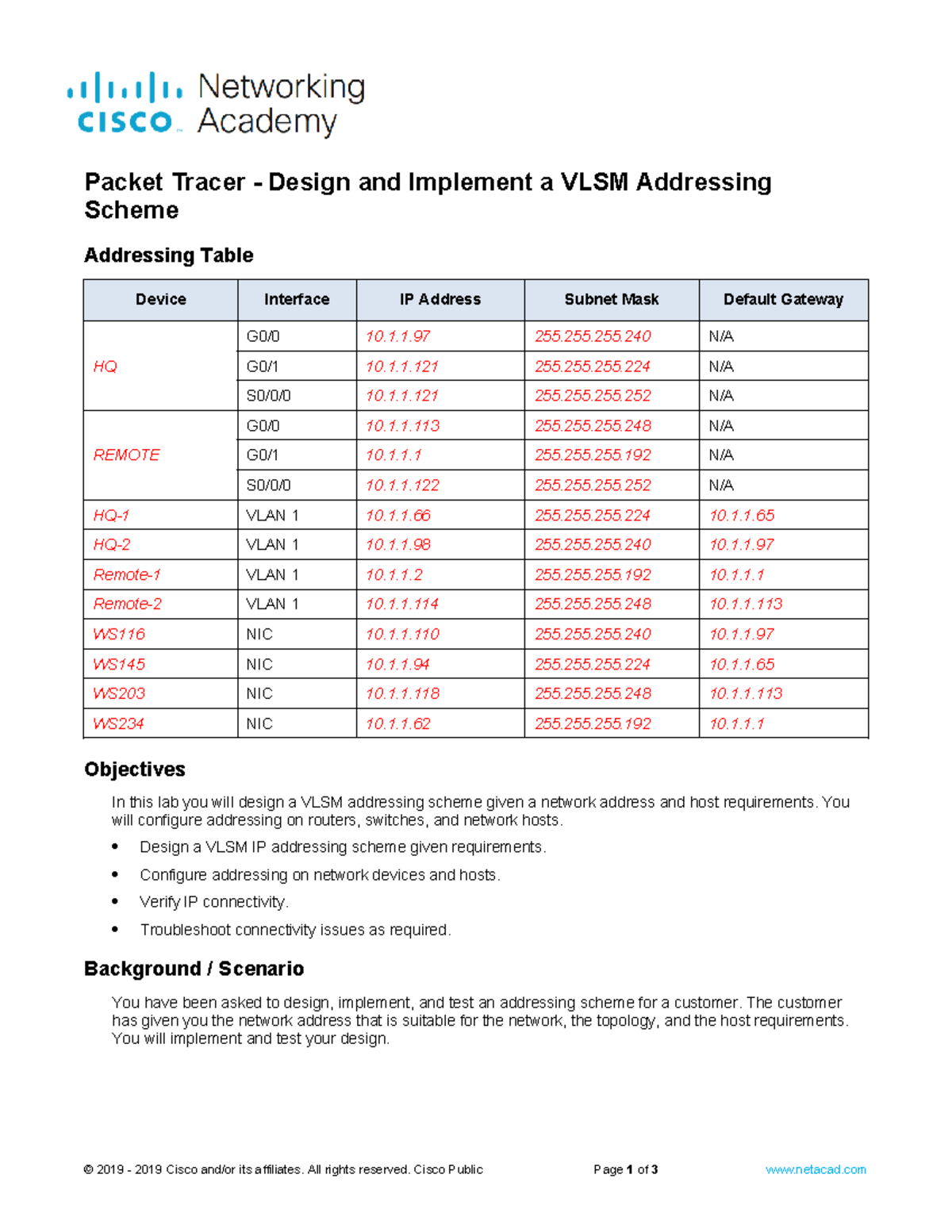 11.10.1 Packet Tracer - VLSM Addressing Scheme Design and ...