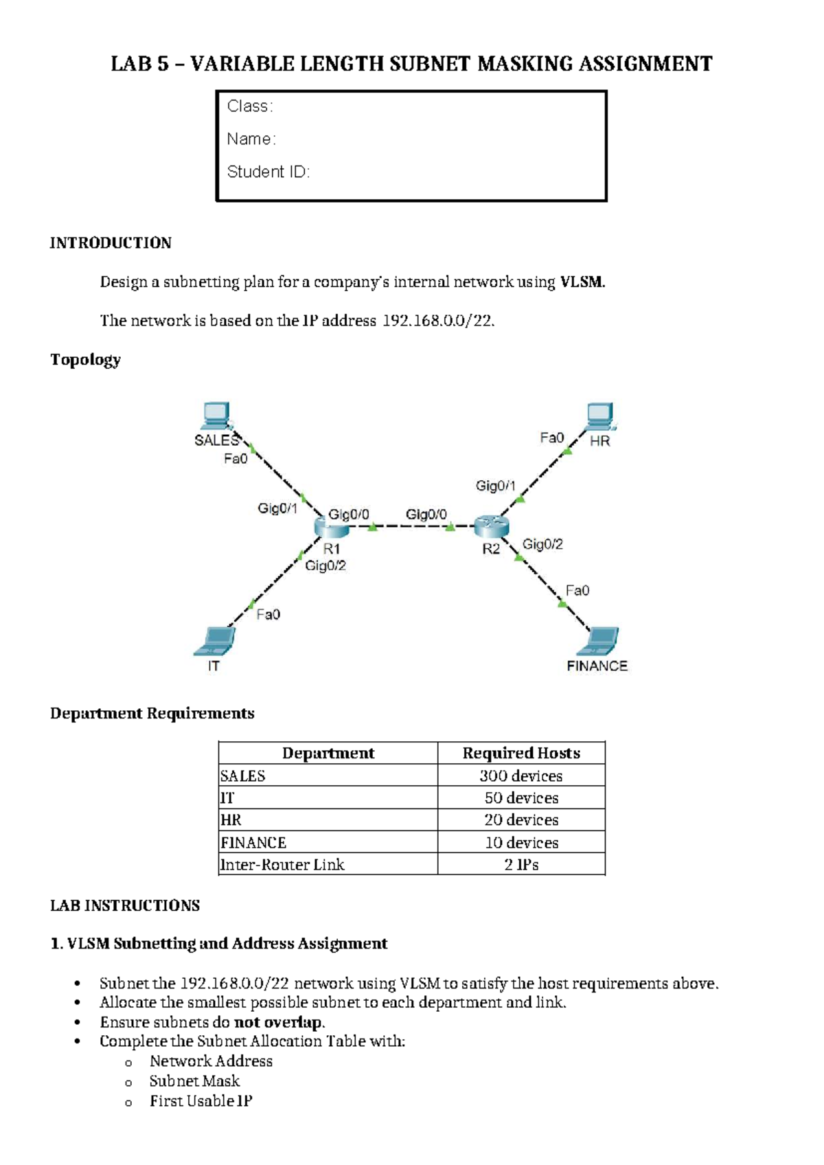 Lab 5 - VLSM Subnetting Assignment for Internal Network - Studocu