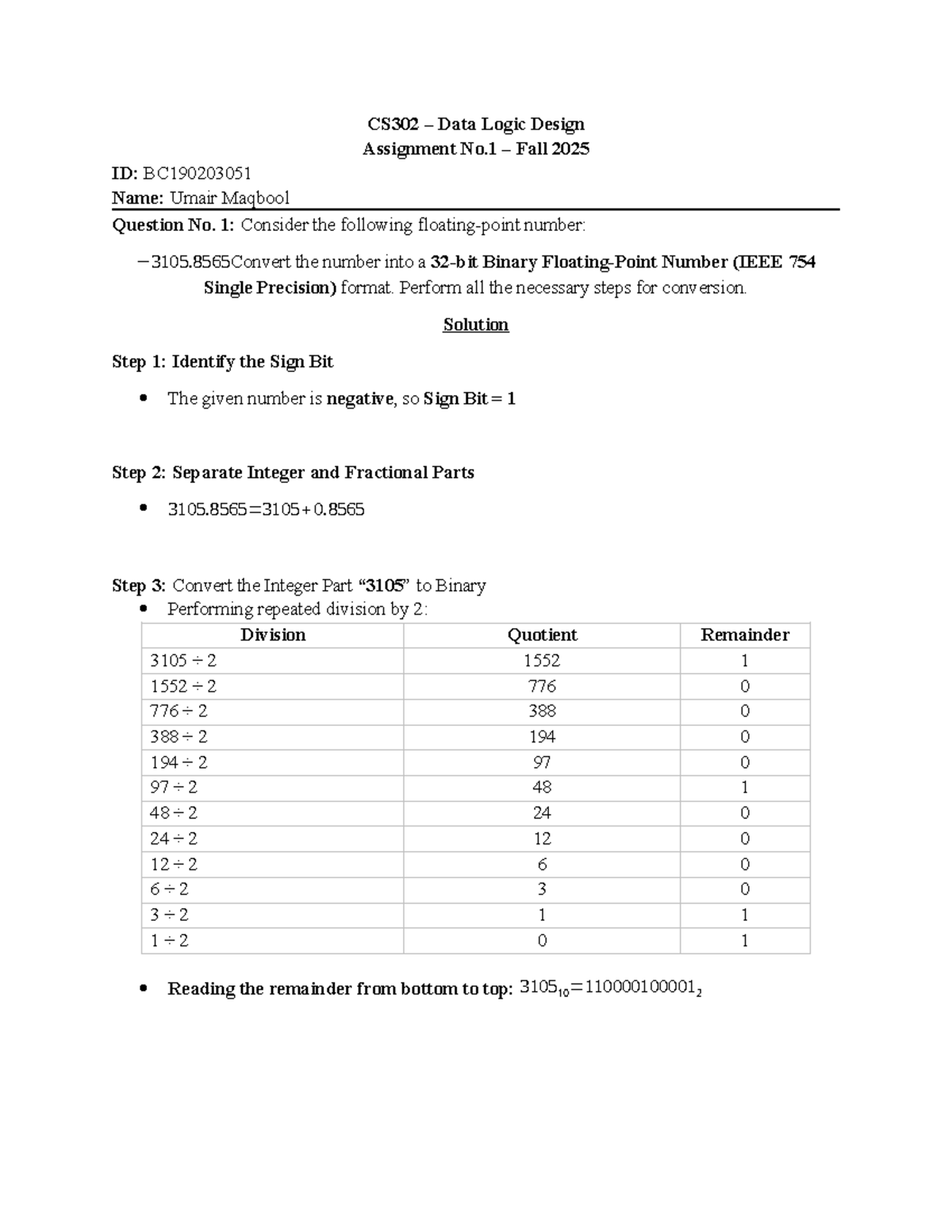 CS302 Data Logic Design Assignment 1: Binary Conversion Steps - Studocu
