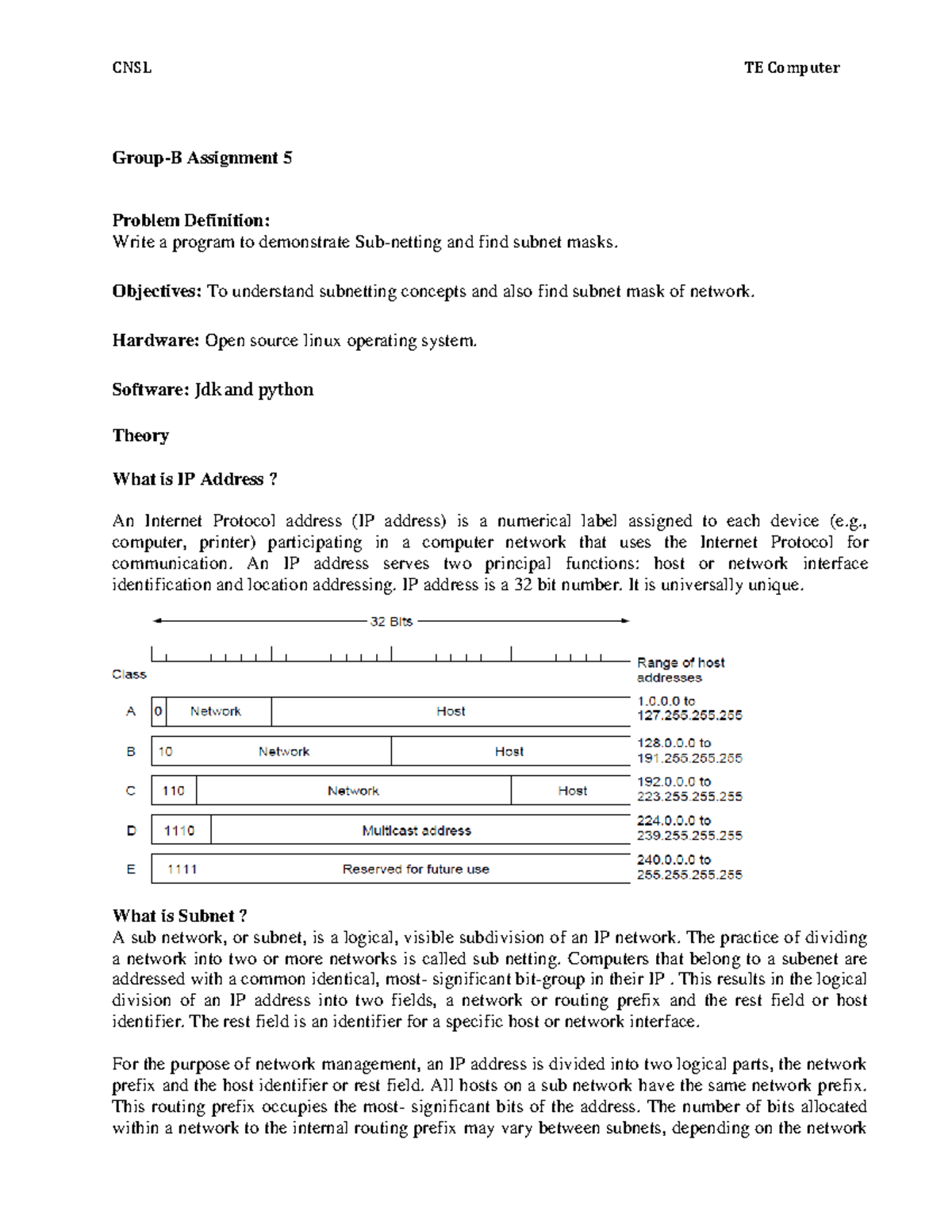 CNSL TE Computer Assignment 5: Subnetting Concepts and Masks - Studocu