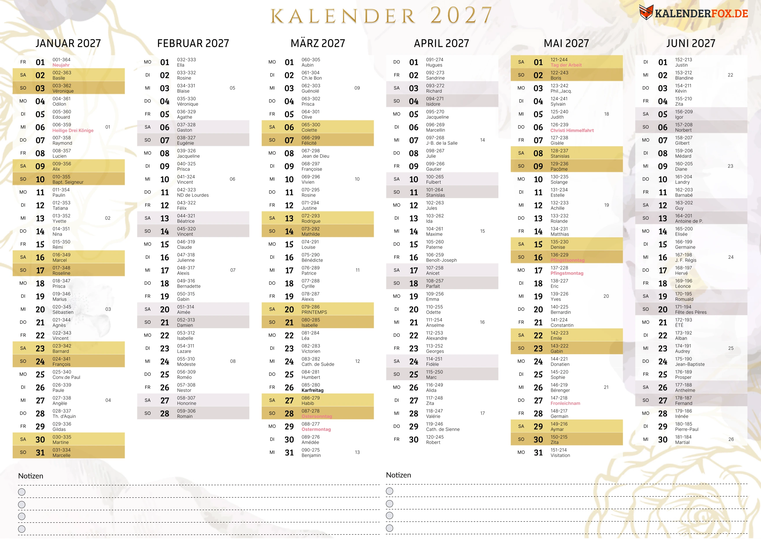Kalender 2027 zum Ausdrucken PDF : Feitagen + Ferien