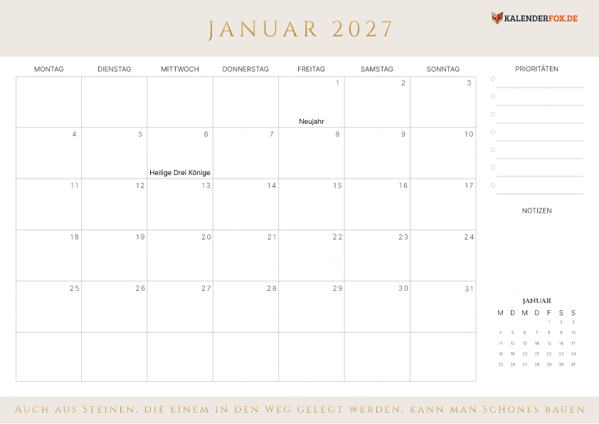 Kalender Januar 2027 zum Ausdrucken · PDF Vorlage