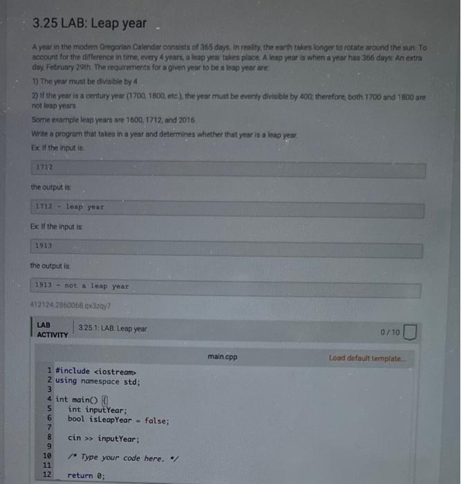 Solved 3.25 LAB: Leap year A year in the modem Gregorian | Chegg.com