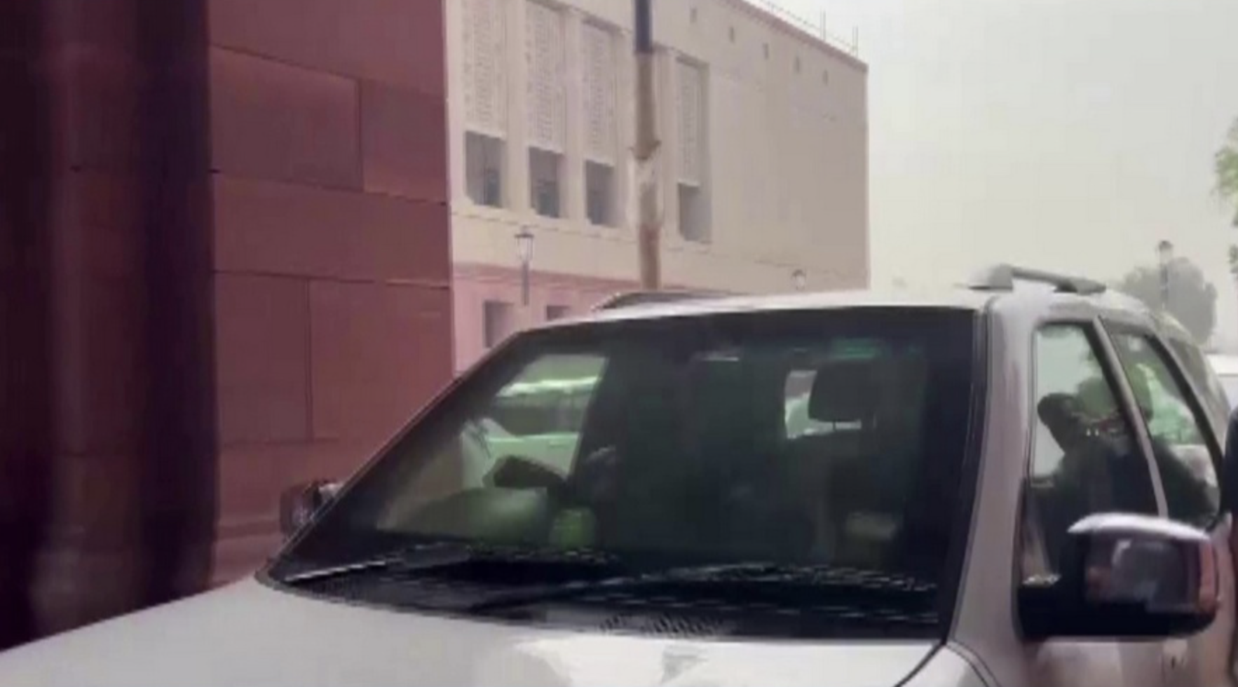 Based on this image's title: “Rahul Gandhi reaches Parliament amid heavy rainfall ahead of voting on ...”