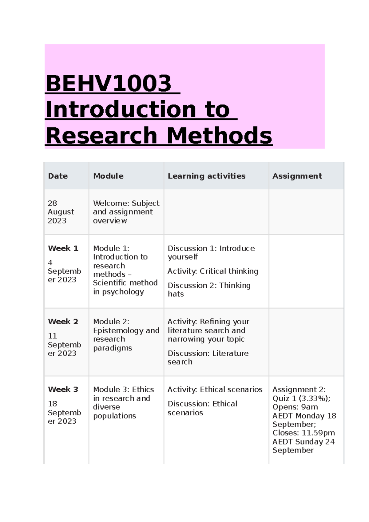 BEHV1003 Introduction to Research Methods assignment outline - BEHV ...