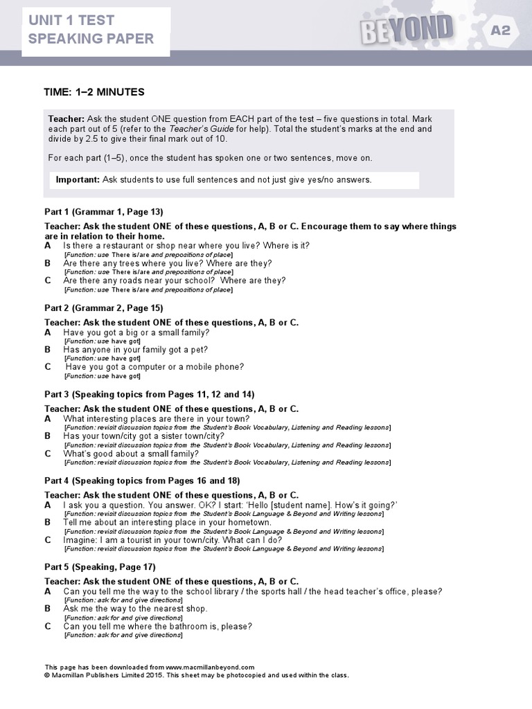 A2 Unit1Test SpeakingPaper | PDF | Question | Communication