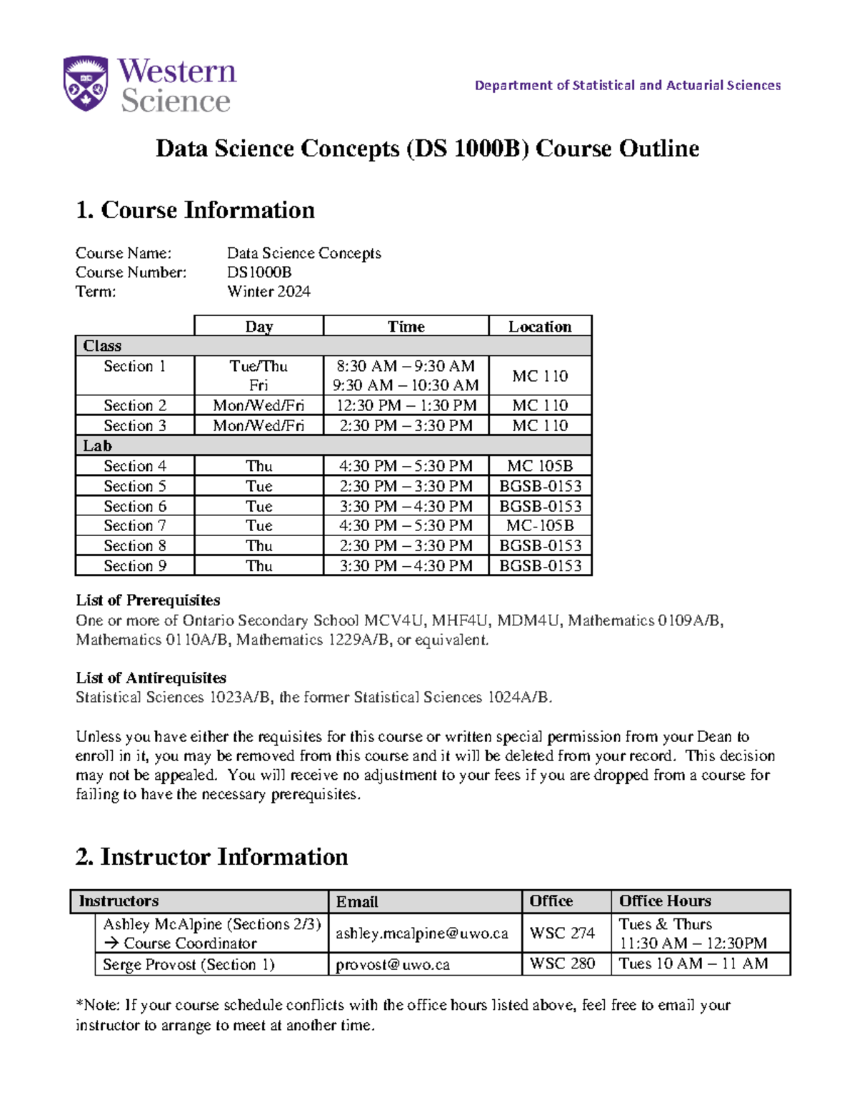 DS1000B - Winter 2024 Data Science Concepts Course Outline - Studocu